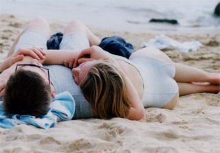 浜辺で彼の胸に頬を預ける金髪の美人をテイク。